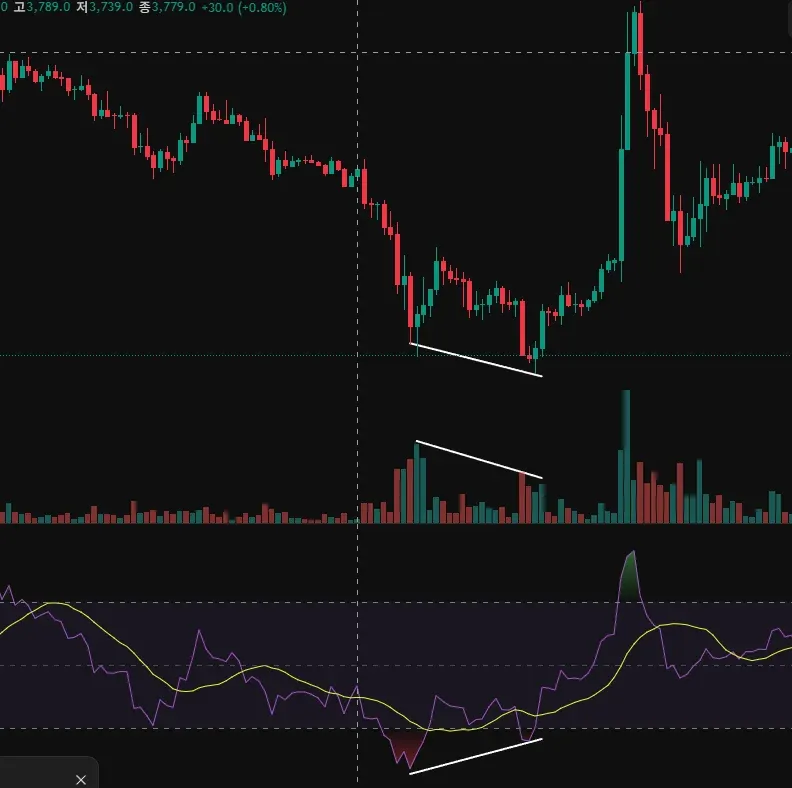 RSI 지표를 통해 상승 다이버전스를 확인할 수 있었고 거래량이 줄어가는 지표를 통해 추세 전환을 예측할 수 있었습니다.