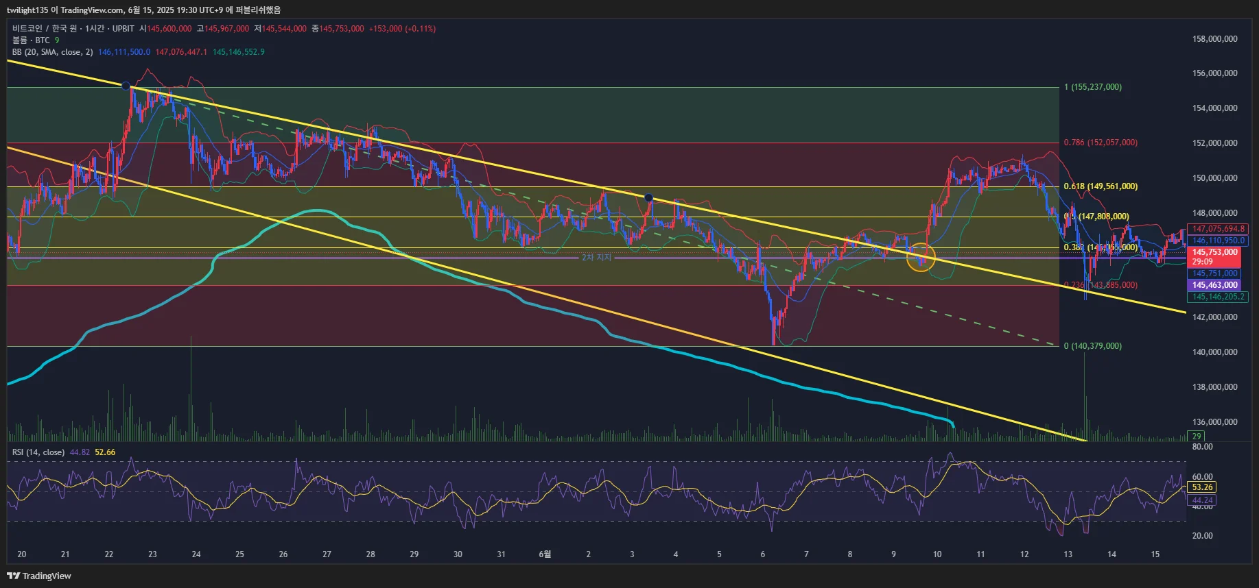 볼린저 밴드를 터치하면서 RSI 가 과매수 구간에 진입하며 피보나치 0.5구간 터치할때 일부 매도