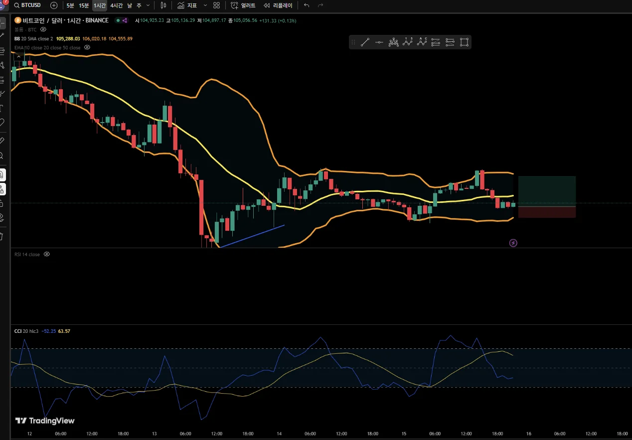 볼린저 밴드 아래쪽에 있어서 하단에 맞으면 손절가, 위에 맞으면 수익 실현 해보겠습니다.