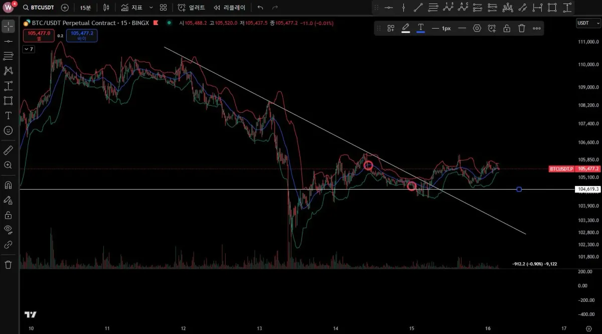 추세선 세번을 터치하고 큰 음봉으로 내려와서 볼밴 중단 약간 위에서 숏 잡아서 매물대 지지구간이라고 생각하는곳, 볼밴하단에서 익절