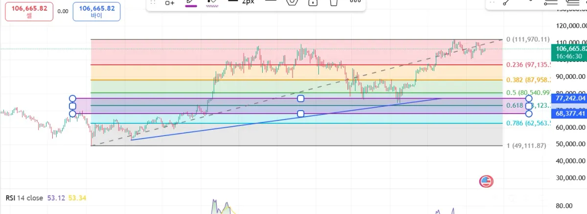저점과 고점도 모두 상승하고 있는 상승추세를 보이나 고점과 저점이 만나는 삼각수렴형태로 보입니다