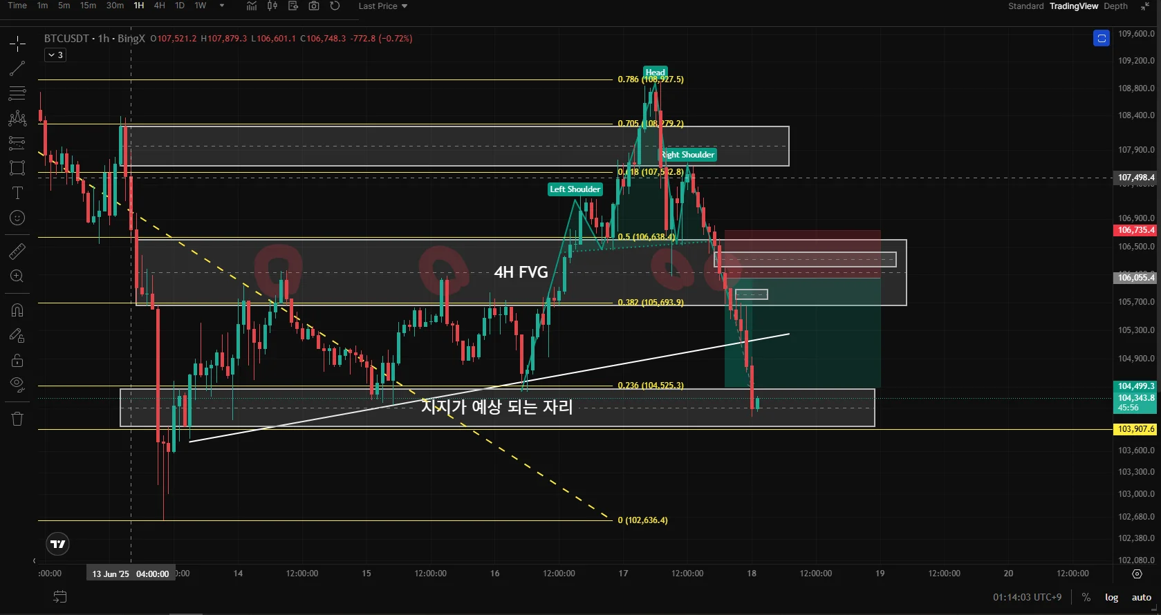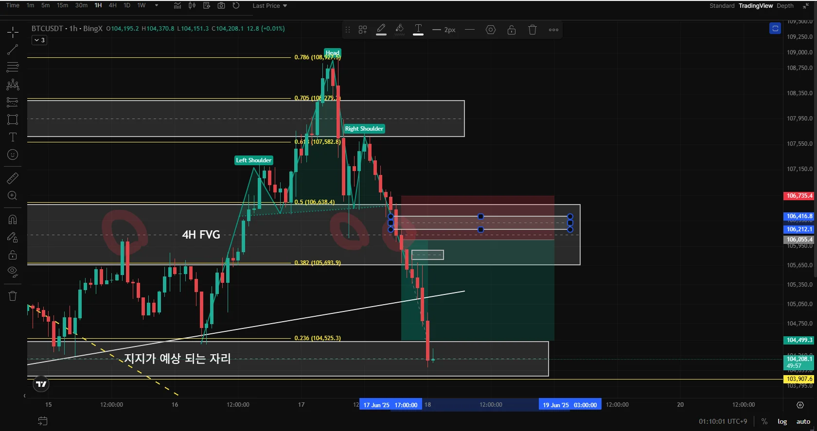 4시간 차트의 FVG의 중간선에서 저항과 지지가 지속적으로 이루어졌음을 감안,