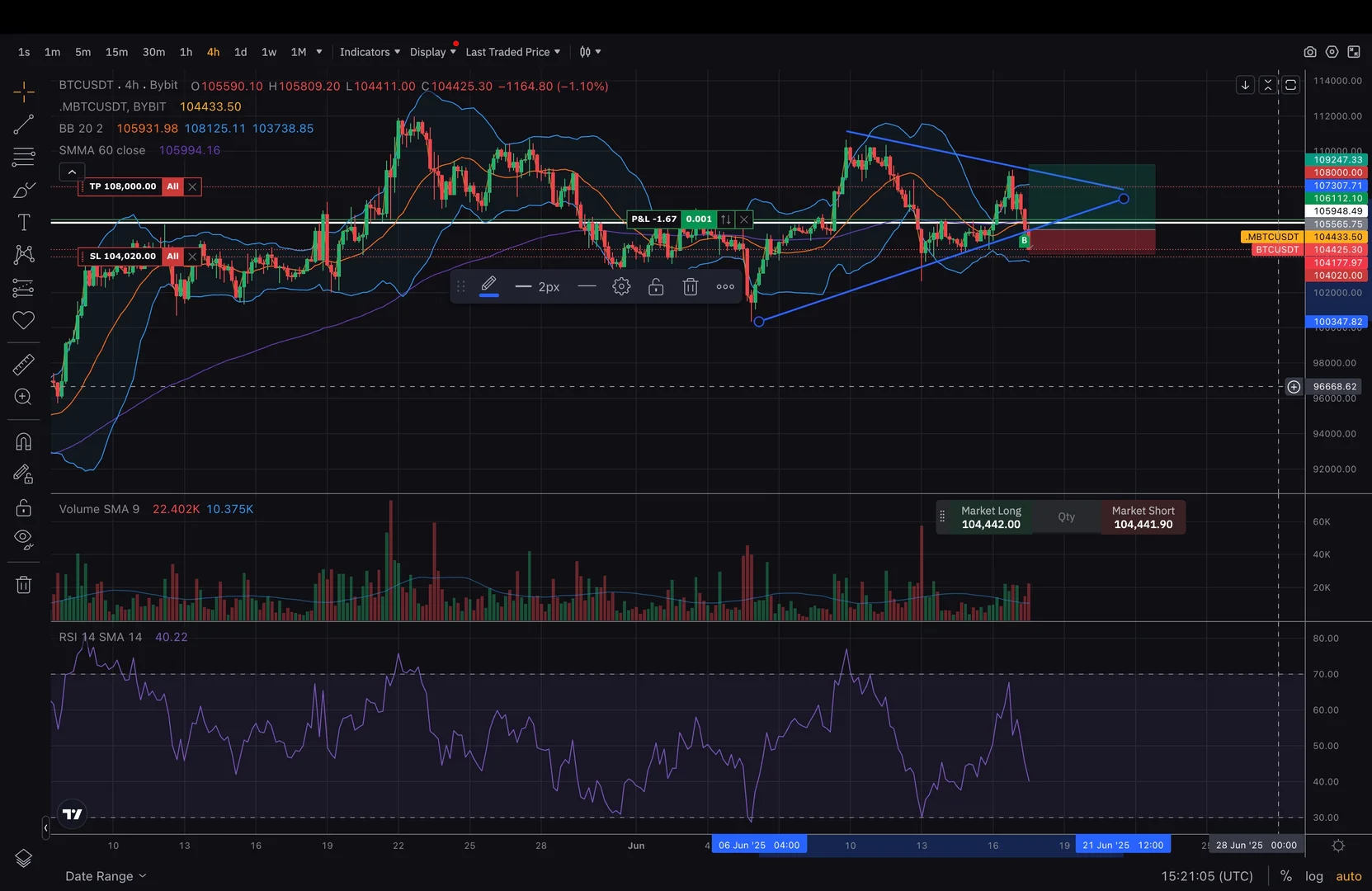 지지선과 저항선 작도후 지지와 저항을 받는것을 확인하였고 다시 지지선을 맞고 위로 올라갈 것을 예상하여 롱 진입