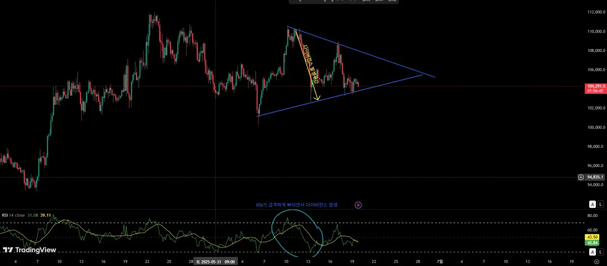 저기 노란색 화살표로 표시 되어있는 구간이 다이버전스가 발생한 구간이라고 볼 수 있고 근거로는 아래 RSI 지표에 매수세가 엄청 강했다가 쭉쭉 빠져 매도세가 강해지는 모습을 볼 수 있습니다!