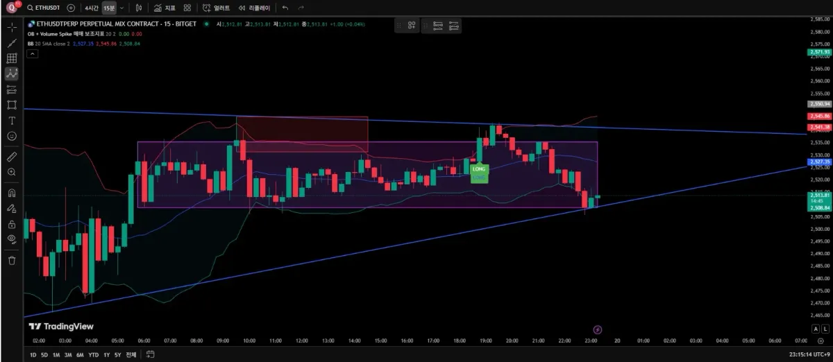 박스권 횡보구간이라 생각하고, 단기 추세선에 터치후 롱이라 판단후 롱진입