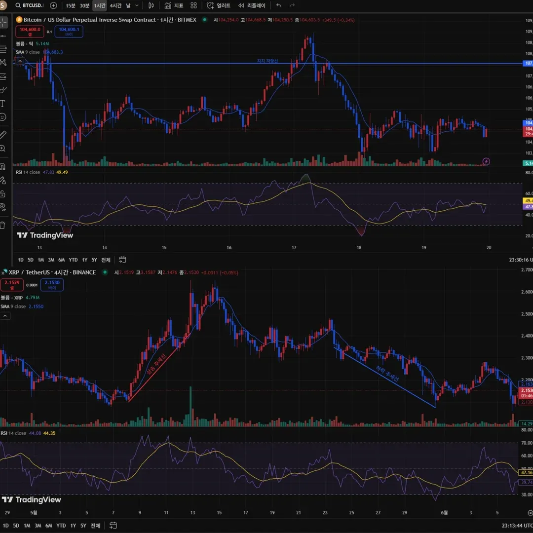 XRPUSDT의 추세선은 5월의 차트를 이용하여 7일을 시작으로 13일까지 상승 추세선으로 작도하였고 23일부터 29일은 하락 추세선으로 작도하였습니다.