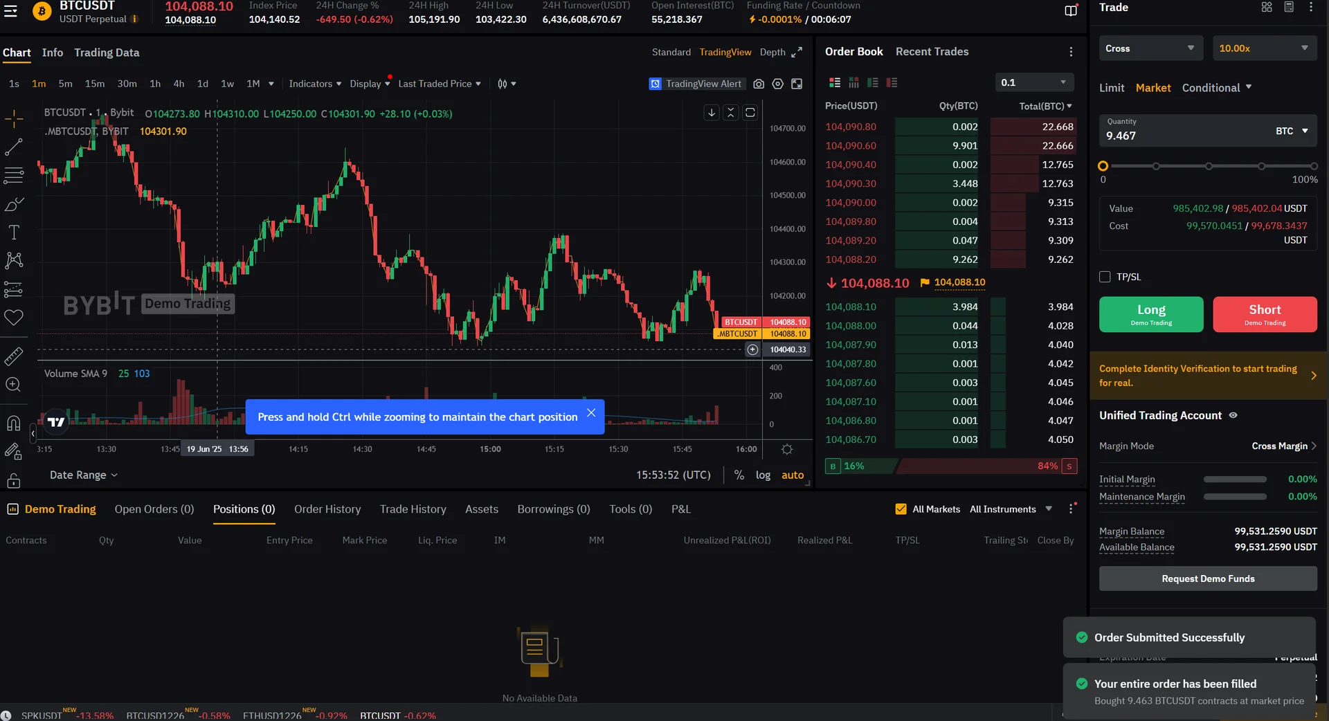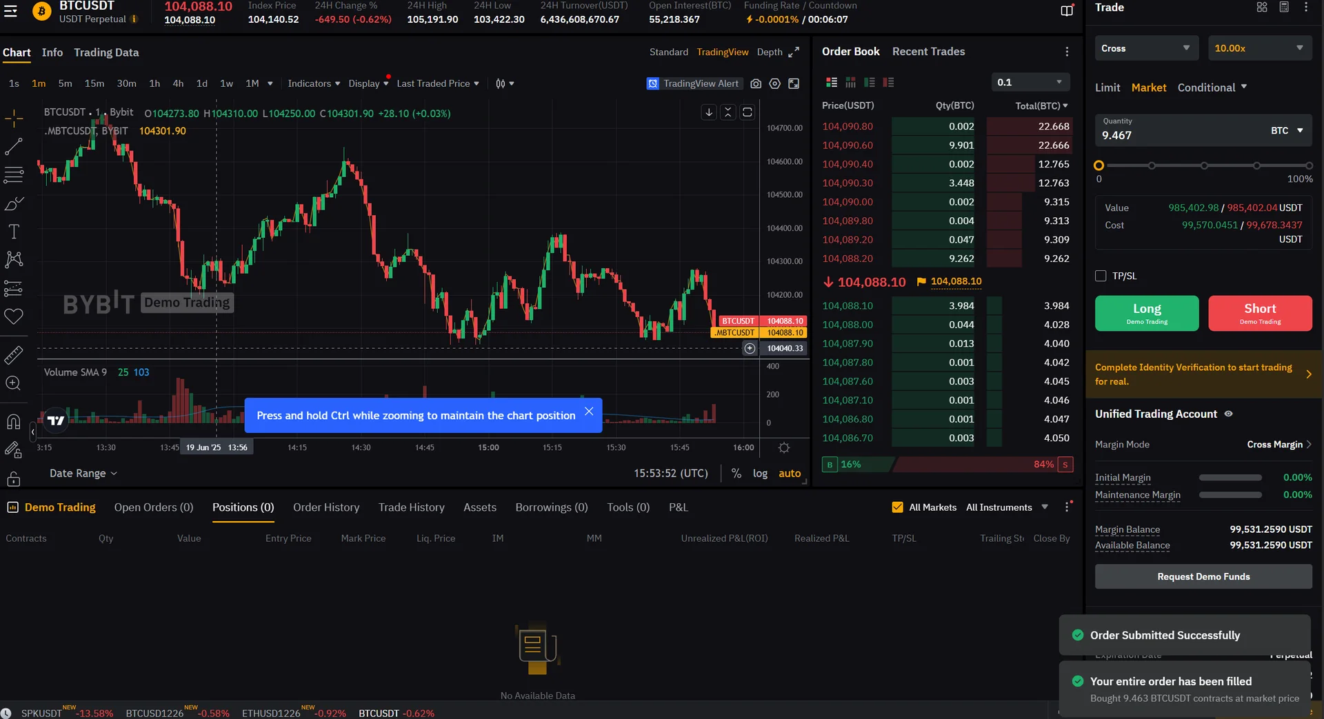 아직 바이비트 이용하는 과정이 미숙한데 모의트레이딩 진입부터 마켓 체결까지 진행해보았습니다. 지지선 깨지고 거래량 늘어남과 동시에 15초 숏 들어가보았습니다.