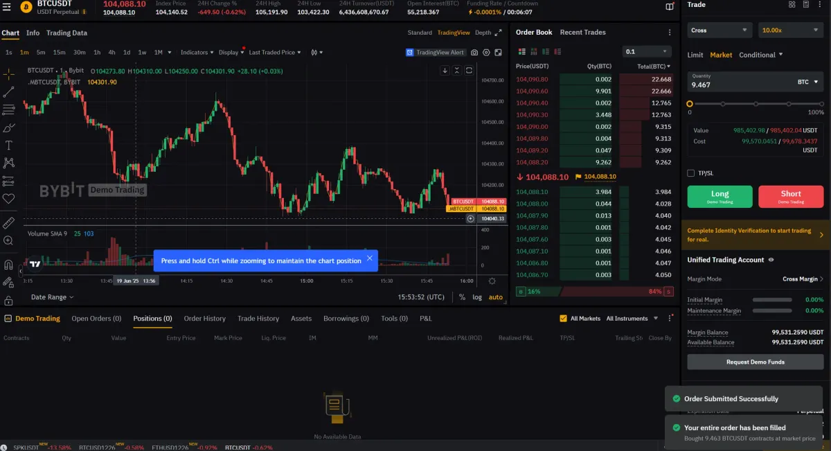 아직 바이비트 이용하는 과정이 미숙한데 모의트레이딩 진입부터 마켓 체결까지 진행해보았습니다. 지지선 깨지고 거래량 늘어남과 동시에 15초 숏 들어가보았습니다.
