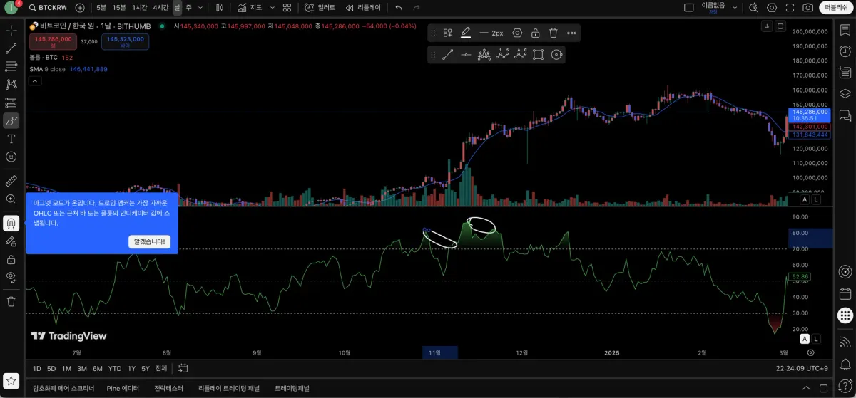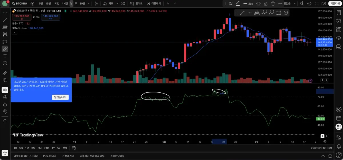 단기로 넓게 펼쳤을 때 두번째 동그라미가 하락 다이버전스입니다. (첫번째는 작지만 차트의 흐름과 다른 것 같아서 표시해봤습니다)