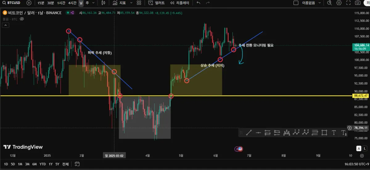 BTCUSD / BINANCE 1봉 기준 지지선 저항선 실습 미션