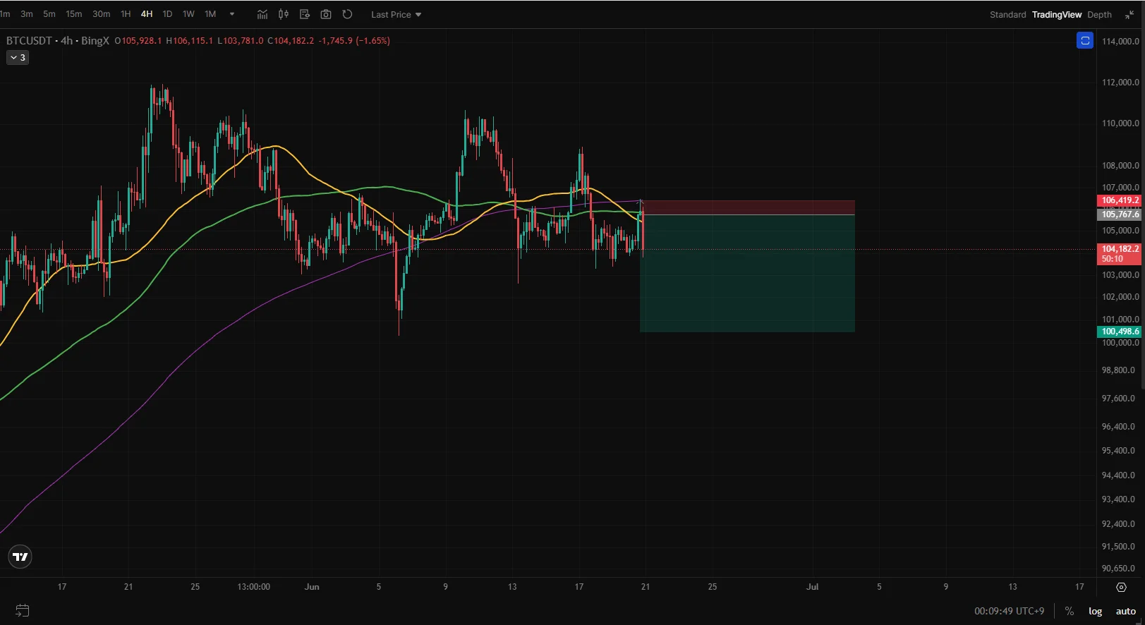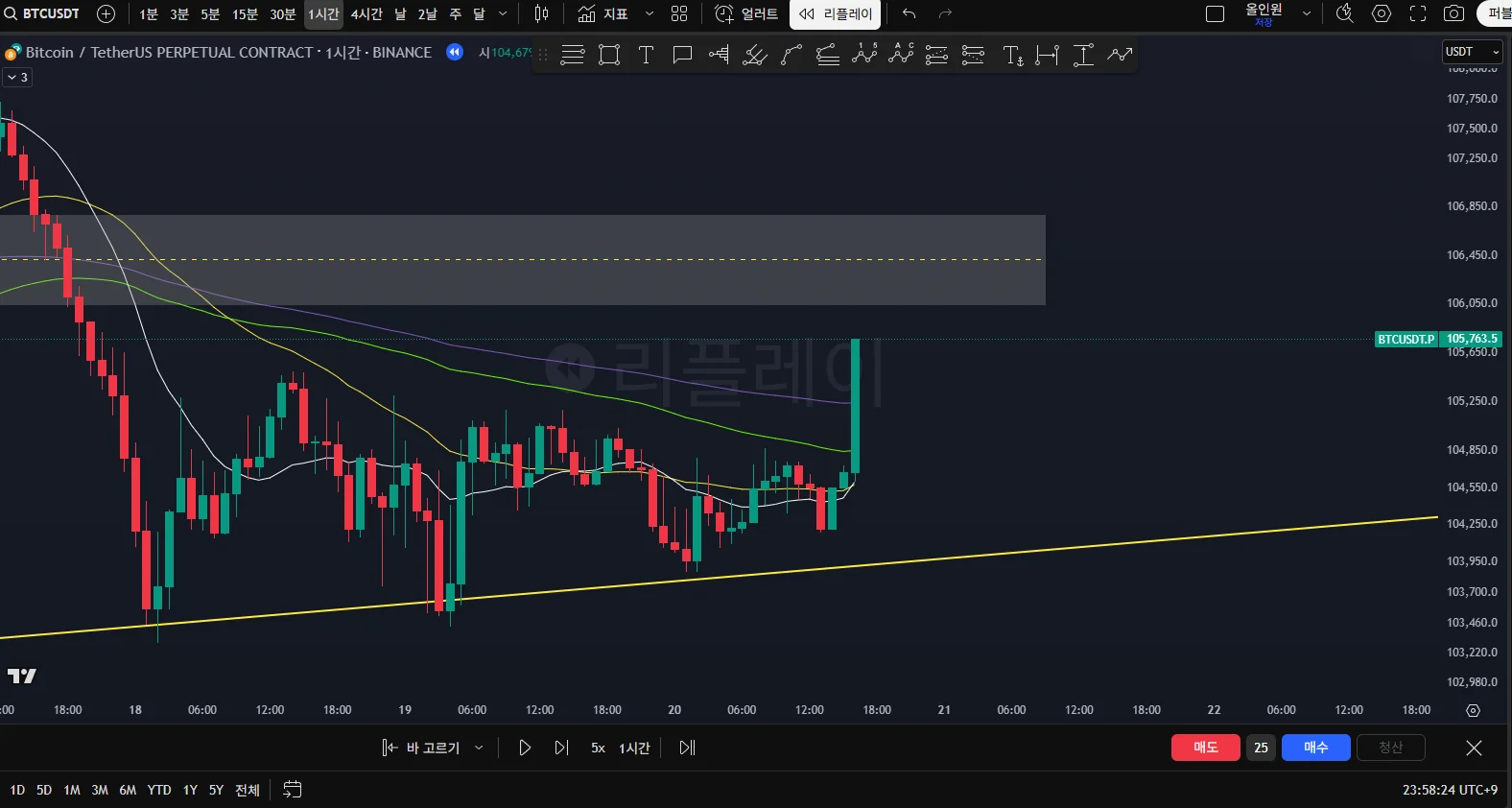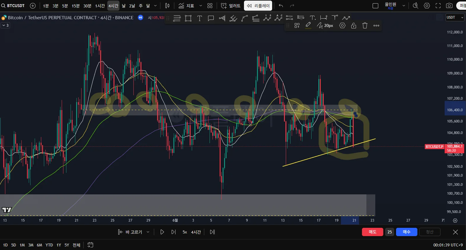 4시간봉 차트를 보면 지지/저항이 서로 뒤바뀌는 엎치락 뒤치락 영역....
