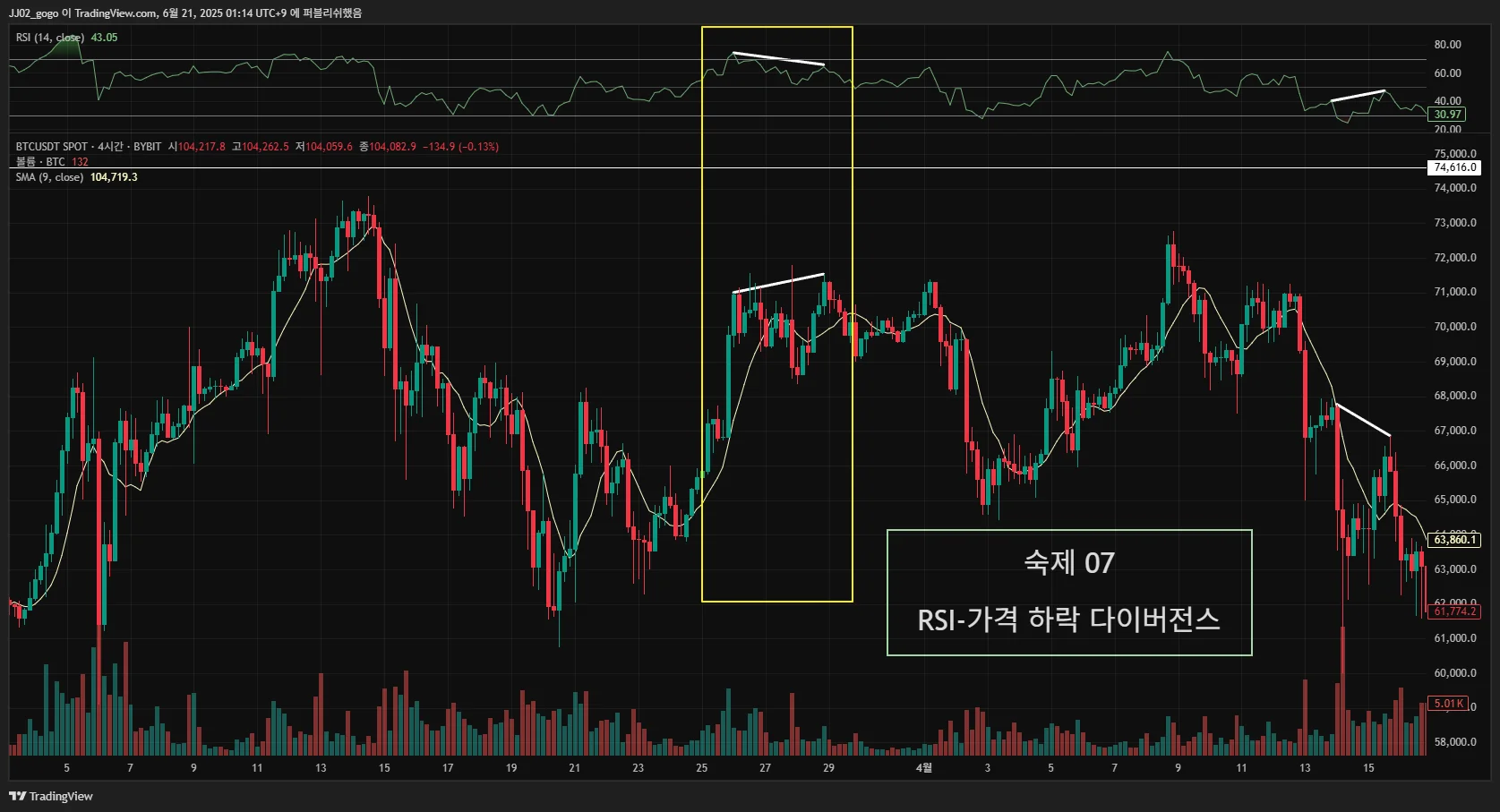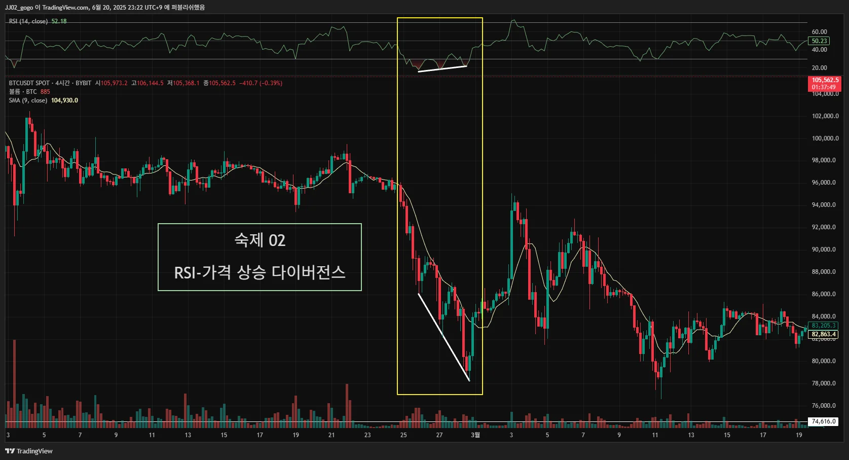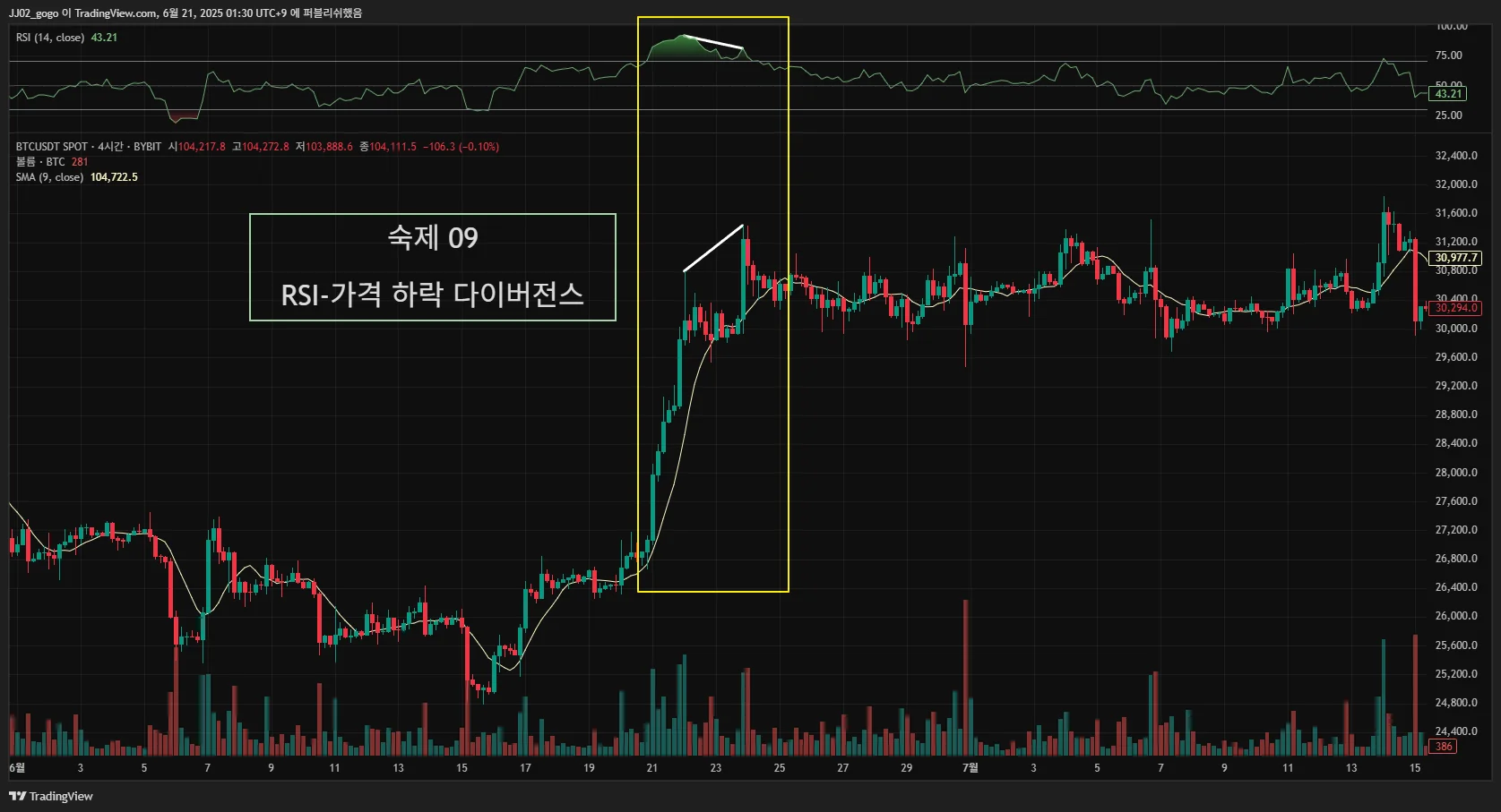 2. 실제 다이버전스가 나온 구간을 체크해서 캡쳐해 투딩 커뮤니티 30일 챌린지 게시판에 업로드해주세요.