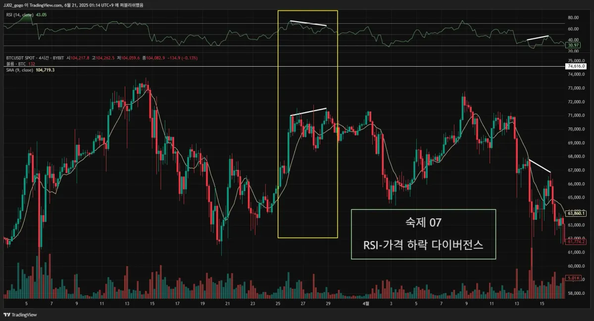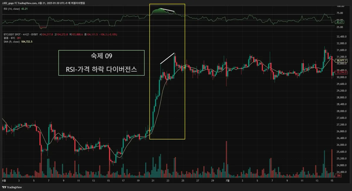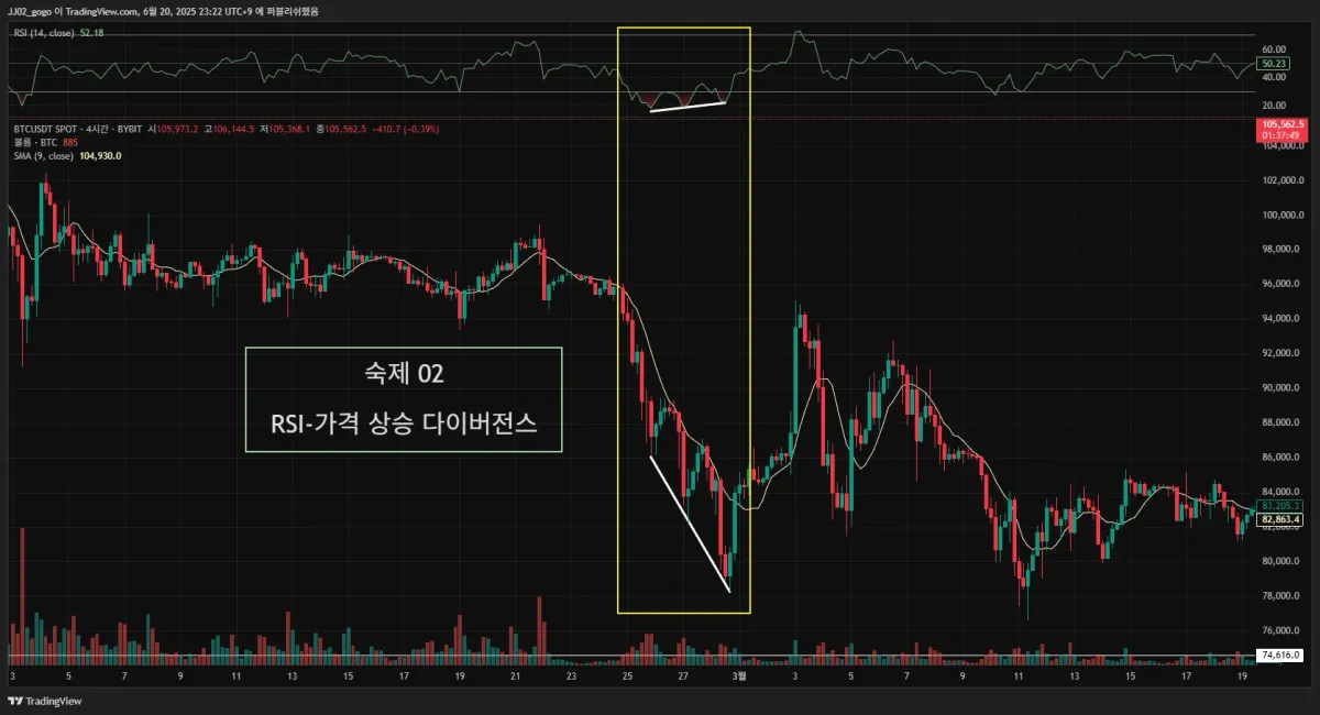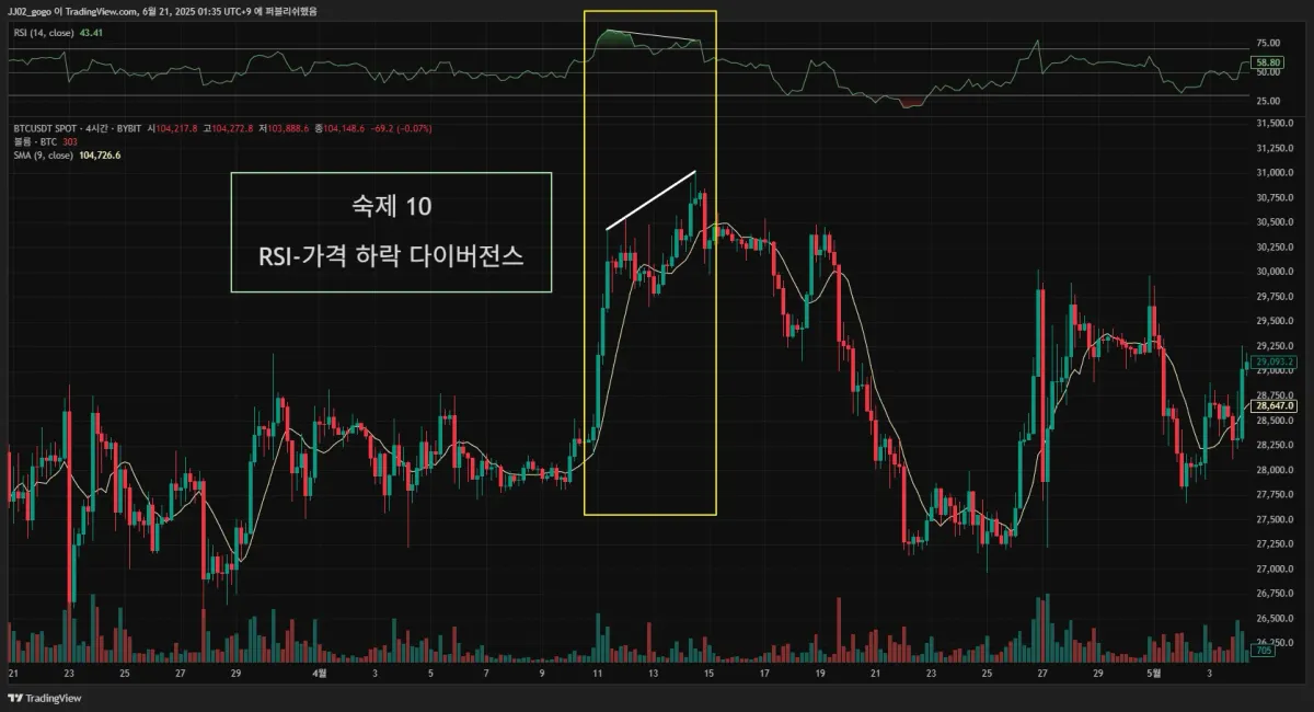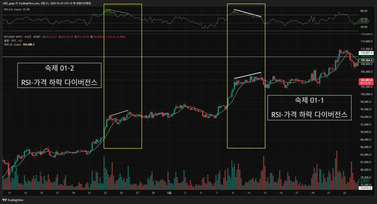 2. 실제 다이버전스가 나온 구간을 체크해서 캡쳐해 투딩 커뮤니티 30일 챌린지 게시판에 업로드해주세요.