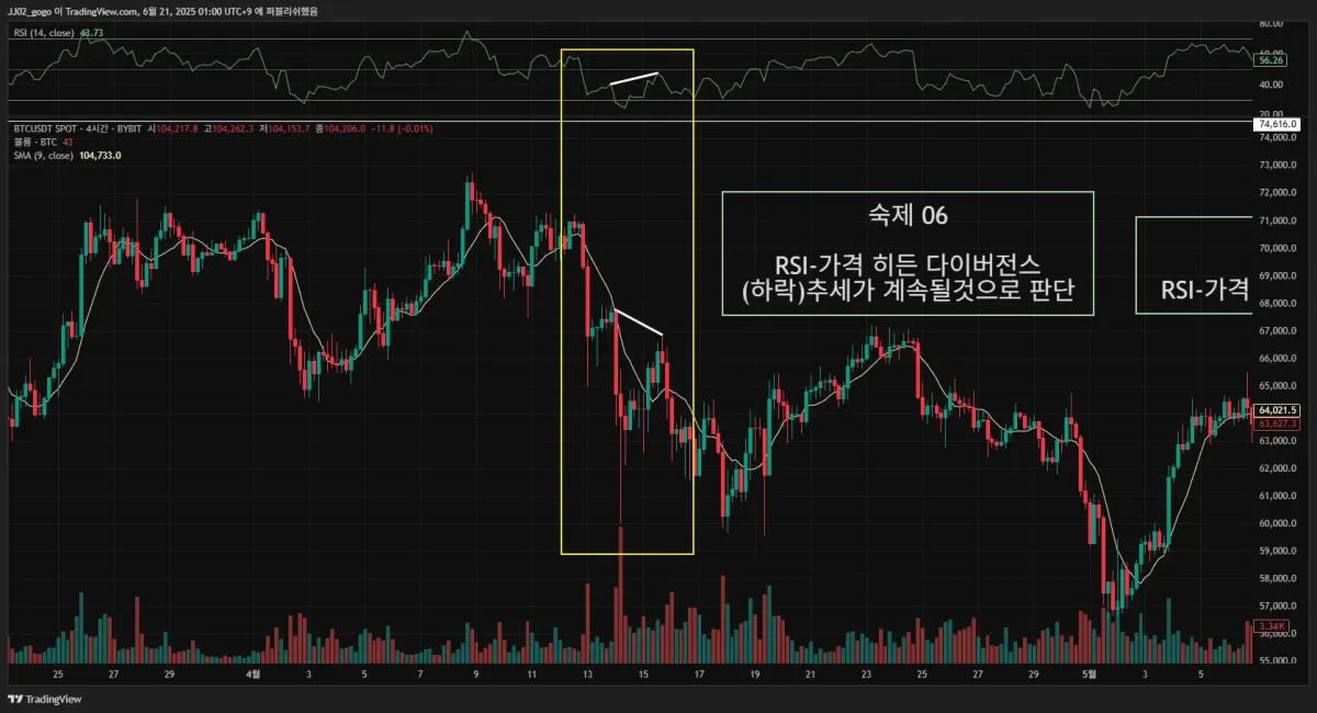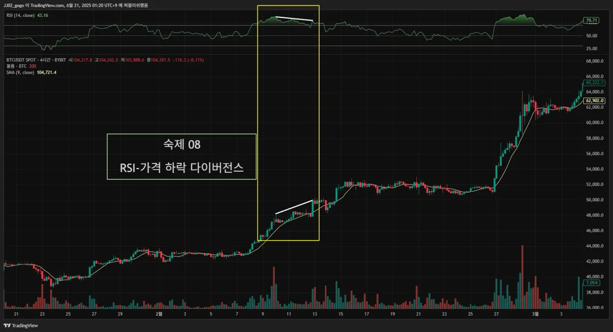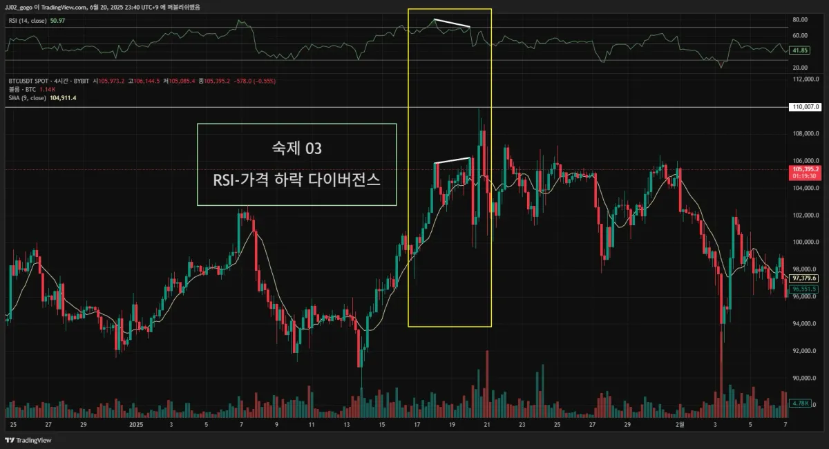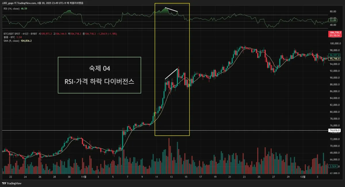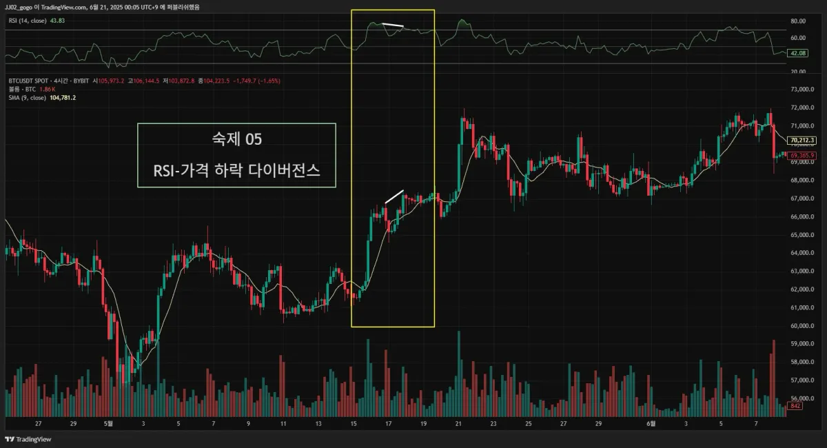 2. 실제 다이버전스가 나온 구간을 체크해서 캡쳐해 투딩 커뮤니티 30일 챌린지 게시판에 업로드해주세요.