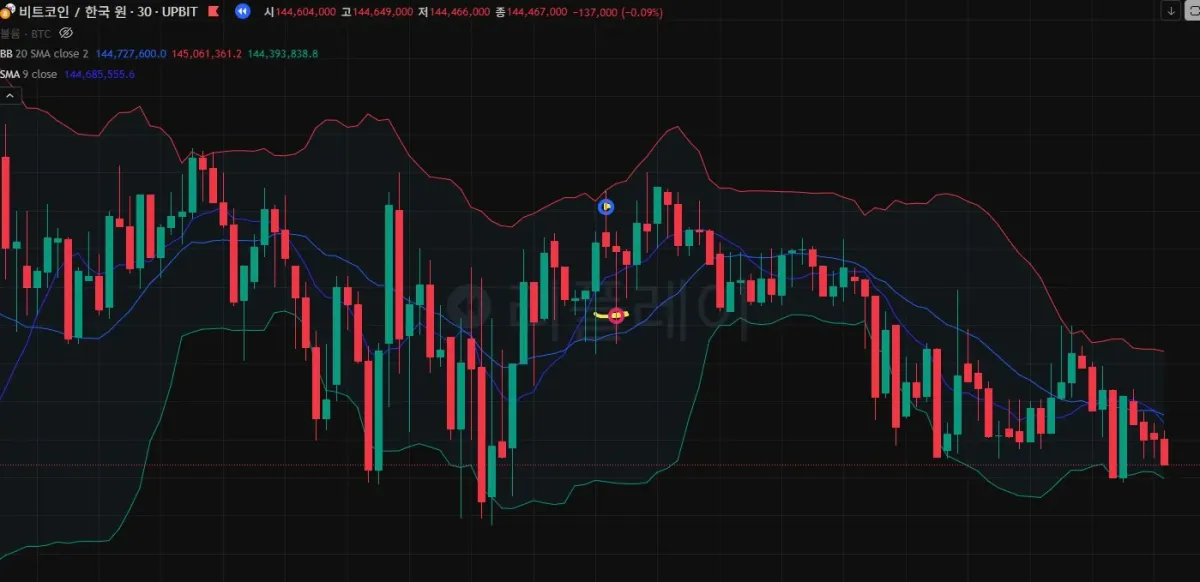 저시기에 이렇다 할 패턴이 안보이고 아직 볼줄모르는거같아 머리만 싸매고 고민하는 동안에 저구간 볼린저밴드 상방위치에 닿은걸 보고