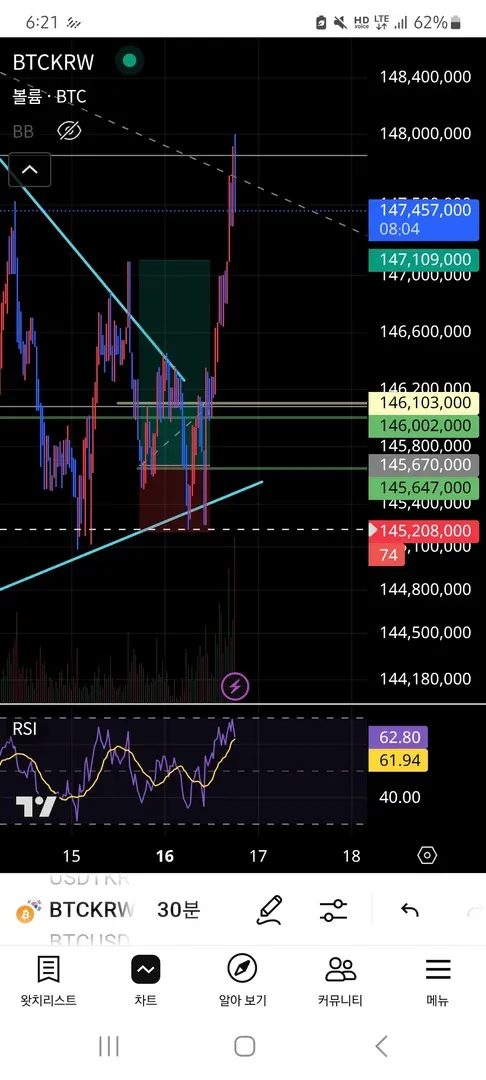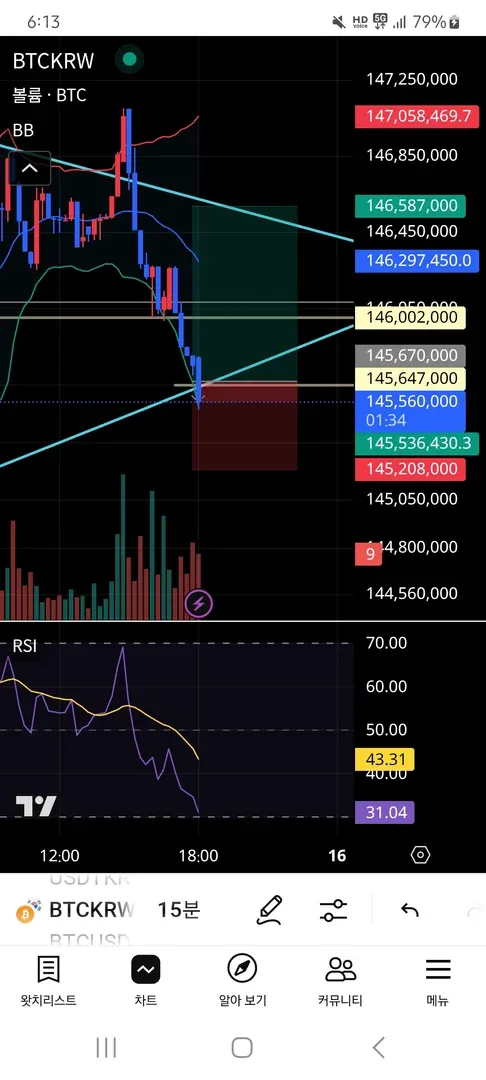 손절 기준: 하단 하늘색 지지선 기준으로 하락 추세 확실해지면 손절.(145,208,000)