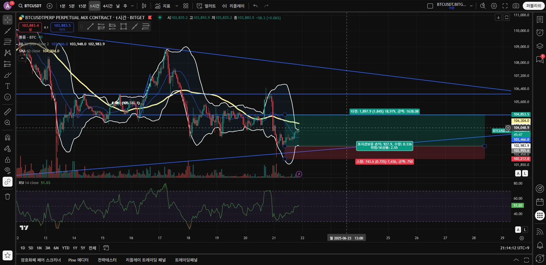 이스라엘 이란 전쟁 여파로 전저점 근처까지 갈때까지 기다릴 생각하고 매매를 안하고 계속 지켜보고 있었으나 생각보다 방어를 잘 해주고 있어서 뒤늦게나마 롱 포지션으로 진입해 보았습니다 주말이라 아직 이렇다 할 움직임은 없지만 약간의 더블바텀을 형성한 것으로 판단하고 과감하게 진입해 보았습니다 직전 고점을 뚫기는 힘들어 보여 직전 매물대들이 몰려있고 큰 하락이 있은 지점의 절반 지점을 익절 부분으로 생각하였습니다