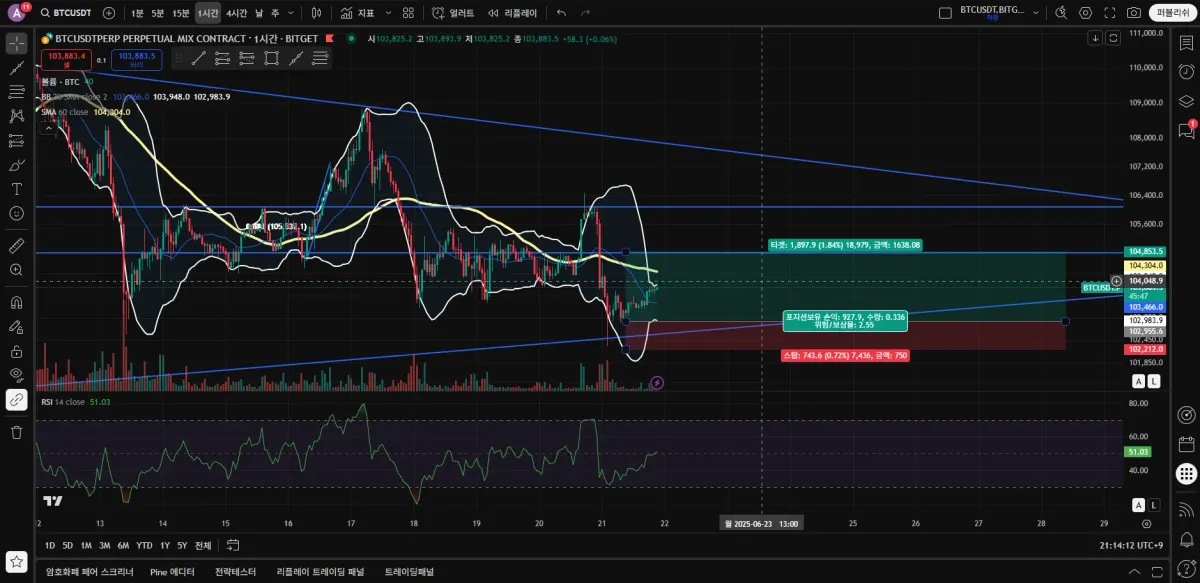 이스라엘 이란 전쟁 여파로 전저점 근처까지 갈때까지 기다릴 생각하고 매매를 안하고 계속 지켜보고 있었으나 생각보다 방어를 잘 해주고 있어서 뒤늦게나마 롱 포지션으로 진입해 보았습니다 주말이라 아직 이렇다 할 움직임은 없지만 약간의 더블바텀을 형성한 것으로 판단하고 과감하게 진입해 보았습니다 직전 고점을 뚫기는 힘들어 보여 직전 매물대들이 몰려있고 큰 하락이 있은 지점의 절반 지점을 익절 부분으로 생각하였습니다