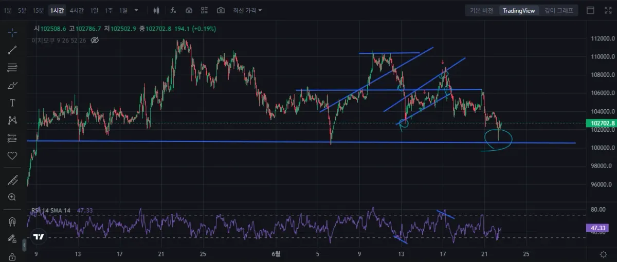 - 17일 추세선 상단, rsi값 다이버를 기대로 손익비 1:1 구간 / 하지만 상단 손절부근에 추가진입후 빠르게 손절도 고려해 진입 / 아래 하단 청산