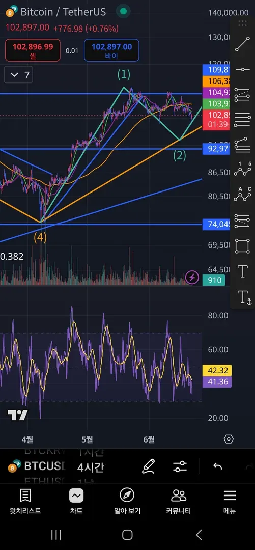 사정이 생겨 컴퓨터를 못써 휴대폰으로 캡처해 올립니다 현재 비트코인은 과매도 국면까진 아니여도 어느정도 매도 국면에 위치할 것으로 보이고 주가의 저점이 추가로 하락하고 RSI는 저점이 갱신되지 않고 상승을 한다면 상승다이버전스가 형성될 것 같습니다.