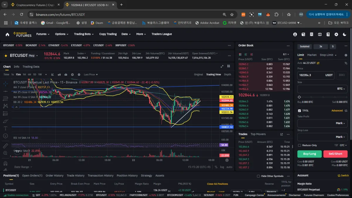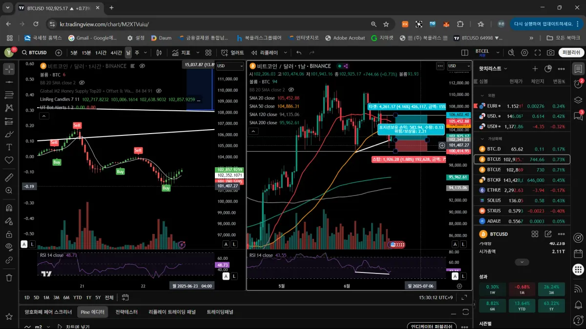 1. 일봉 상승다이버전스 2. 손익비 1;2 3. 손절가 전저점 100,414 4. 목표가 전고점 106,602 5. UT bot 매수 시그널