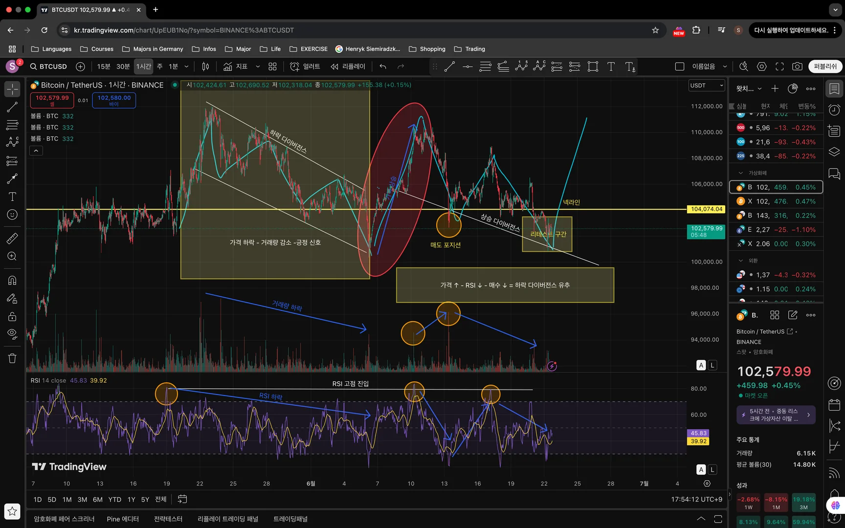 6월 22일 오후 5시 54분 1시간 봉으로 비트코인을 RSI 지표와 거래량을 확인하며 작도 해봤습니다. 배운게 너무 많아서 일단 제 눈에 보이는 하락과 상승점을 기준으로 거래량 RSI 수를 비교하며 작도를 해보니 리테스트 구간을 지난 후 매도 포지션을 준비해야하는 것으로 예측해봅니다. 저도 작도 하면서 확실 하지 않아서 첨삭 부탁드립니다. 감사합니다.