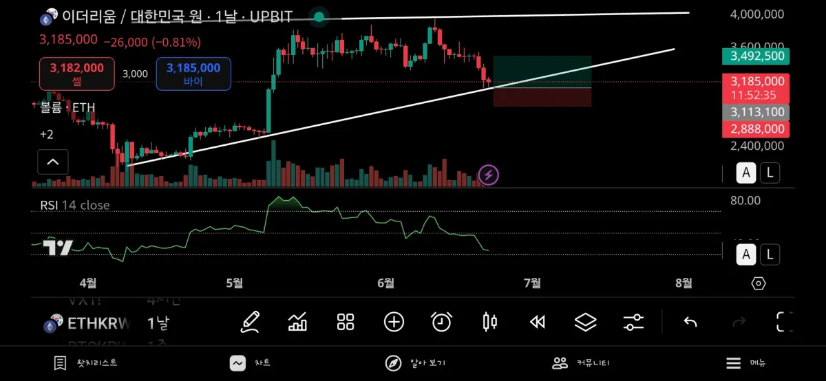 첫 매매인만큼 안전하게 시도해보고 싶어서 하단 지지선에서 매수(약 3,113,100) 약반등 후 매도(약 3,492,500)