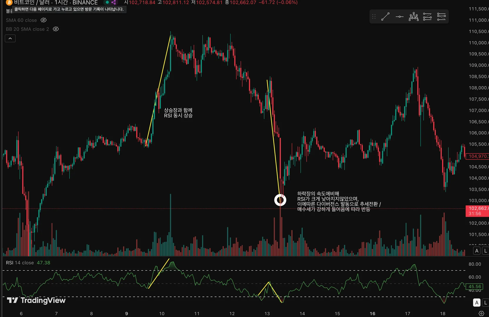 비트 코인 1시간 봉으로봤을때, 표시한 상승선 에 맞춰서 RSI 가 가파르게 상승합니다.