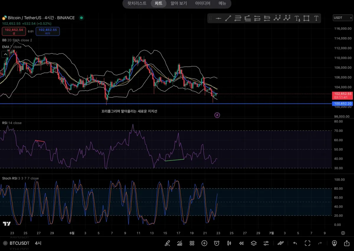 1주차에 작도한 새로운 지지선과 스톡캐스틱 rsi 과매도 구간, 볼린저밴드 하방이탈을 인지 및 3교차확인하여 약반등 진입근거.