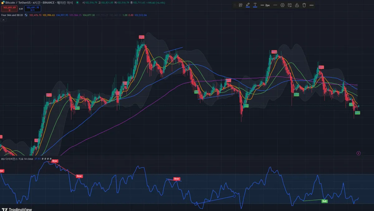 강의 내용을 복습하고 공부하느라 업로드가 늦었습니다. 분석 프로그램의 도움을 많이 받긴 했지만 제가 생각하는 하락 다이버전스구간에 대해 추가로 작도를 그어 미션 완료 했습니다!!!