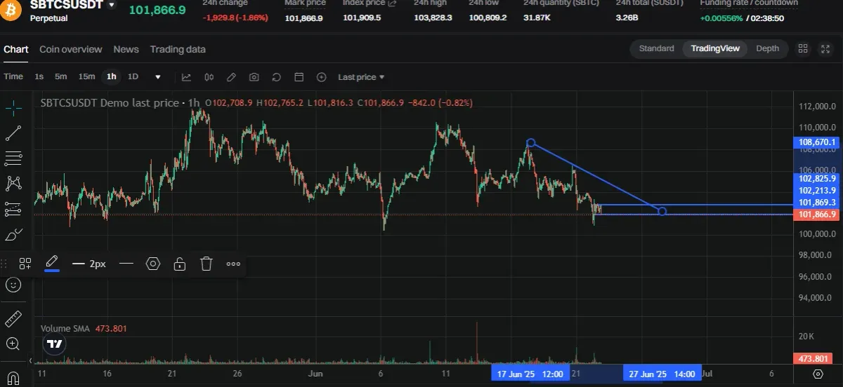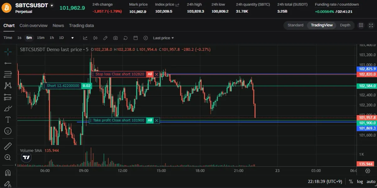 모의트레이딩으로 매매성공! 인증남깁니다. 비트코인 10배레버리지로 숏포지션 진입했고, 근거는 1시간봉상 큰추세가 하락이라서 숏만 잡기로 마음먹었고, 지지저항분석으로 21시 부근에 박스권임을 인지하게 되었습니다.이후 모양새가 쌍봉을 만드는 것 같아서 넥라인 부근에서 바로 숏포지션을 잡았고, 익절은 하단의 지지선까지로 잡았습니다. 손익비가 거의 1:4정도? 되는 것 같네요 배운거를 써먹고 안써먹고의 차이가 큰 것 같아요 배운대로 하니 수익실현이 되는게 너무 신기해요!