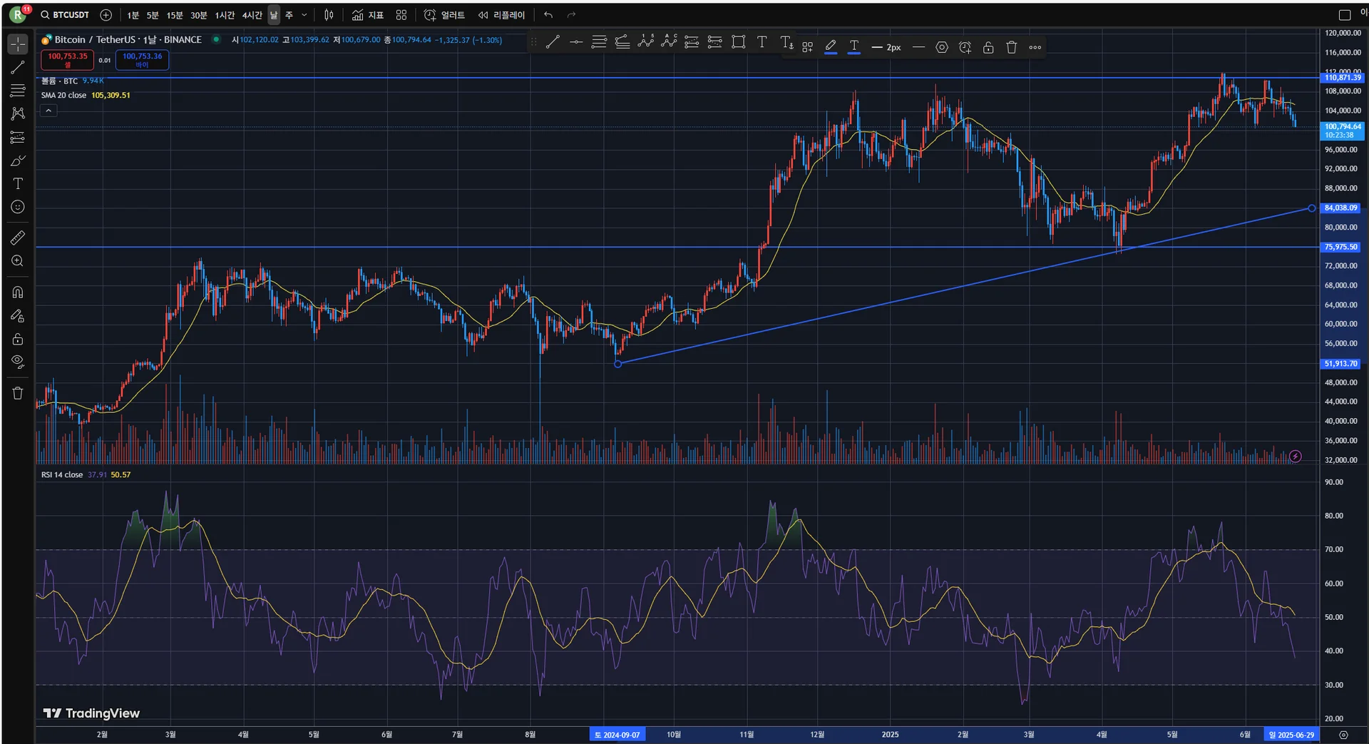 일봉 기준으로 24년 1월 부터 오늘까지의 BTCUSDT 차트에 작도를 해봤습니다.