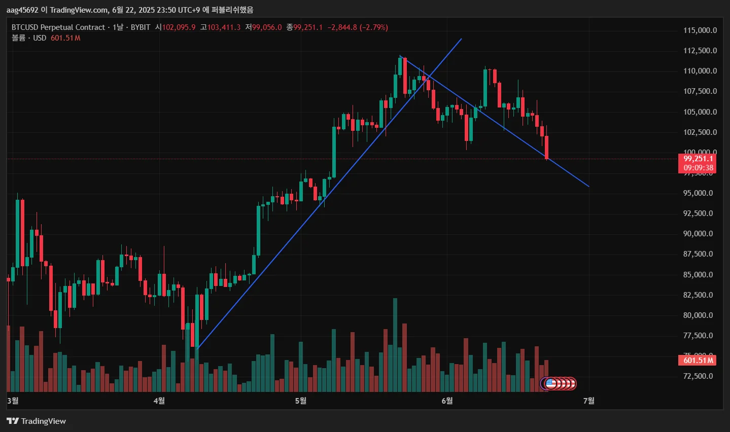 비트코인 차트를 추세선을 그려서 분석해본 결과 4월부터 5월말까지는 지지를 받으며 상승했지만 잠깐의 횡보 후 하락하고 있는 추세로 보입니다. 지금 추세선에서 지지를 받아서 상승전환되지 않는다면 하락 추세로 지속될가능성이 보입니다.