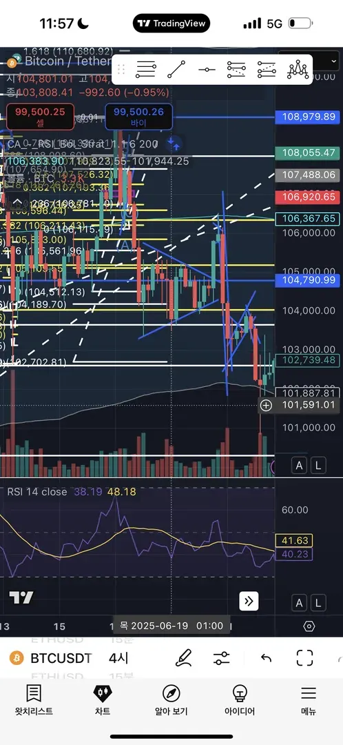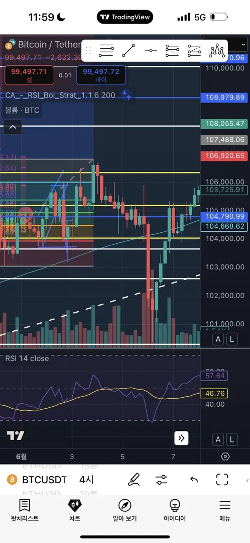 4시간 15분 기준 지지선 확인후에 조정을 어느정도 확인한 이후 반등지점을 예상해서 롱 체결 주문을 걸어놓음-수수료 감면도 있을 뿐더러 예상위치가 아닌 이상 주문체결도 안되므로 손절 날 가능성이 낮다고생각했음!! 그래서 저항선 기준 롱 계약 체결.