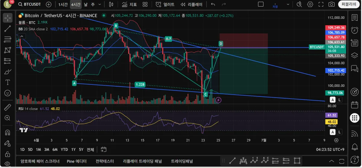 볼밴은 정규분포 95%를 기준으로 만들어 높은 신뢰도를 갖고 있다고 생각하여 사용했습니다. 또 abc 파동을 그려보면 상승 파동인 c의 끝자락이라