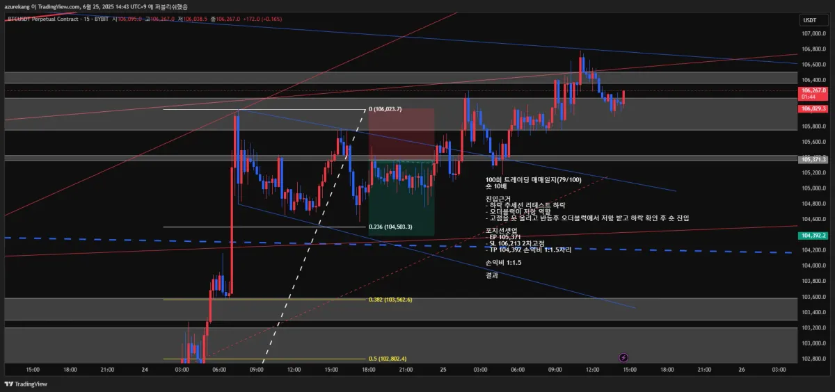 - 전 고점을 갱신하지 못하고 오더블럭에서 저항받고 하락 확인 후 숏 진입