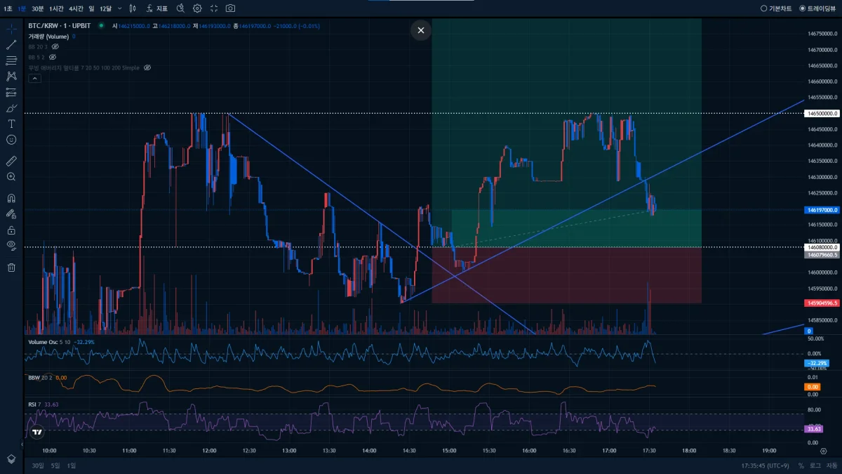 1분봉에서 전 고점 부근 밑꼬리를 길게 그린 지점을 기준으로 유의미한 반응이 있다고 판단하여