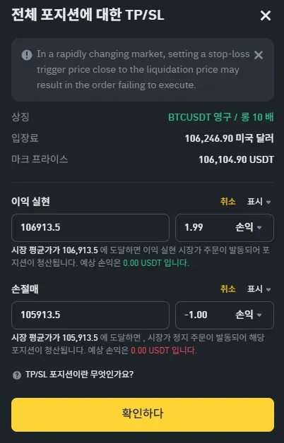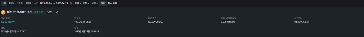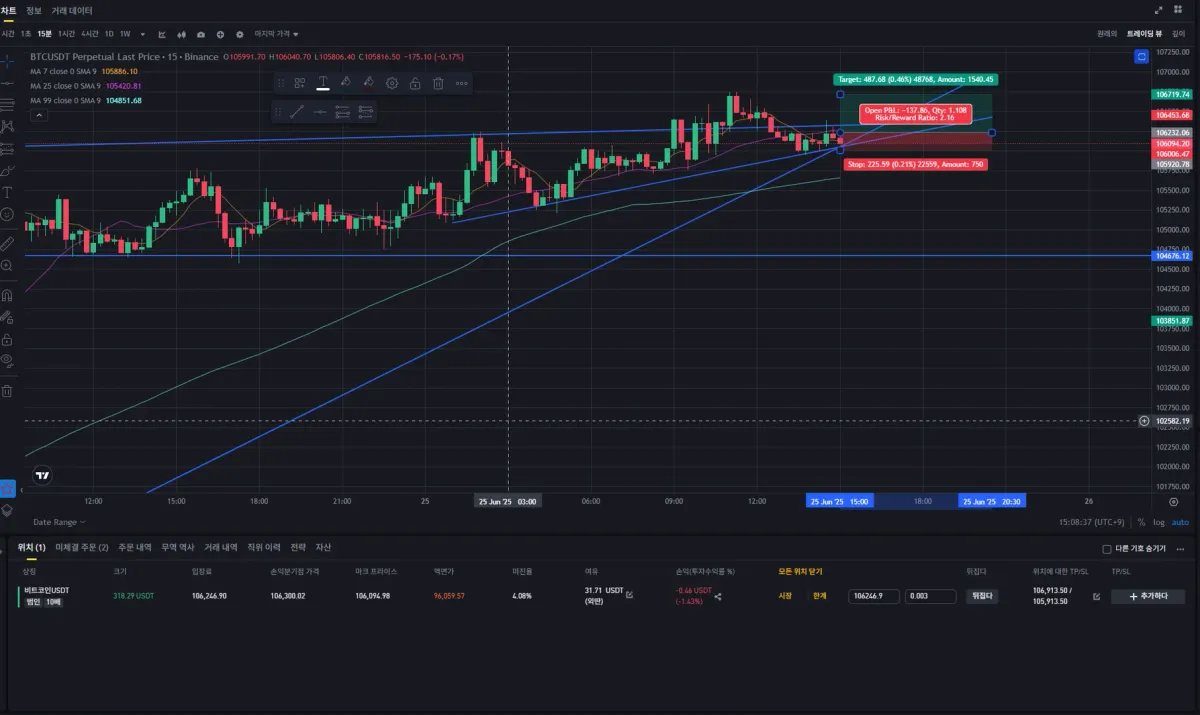 비트코인 선물차트 15분상 삼각수렴 패턴으로 추세선을 긋고 상단 돌파를 시도할 것으로 판단, 106,246.90btc에 10배 레버리지로 370달러 매수 진입하였습니다.