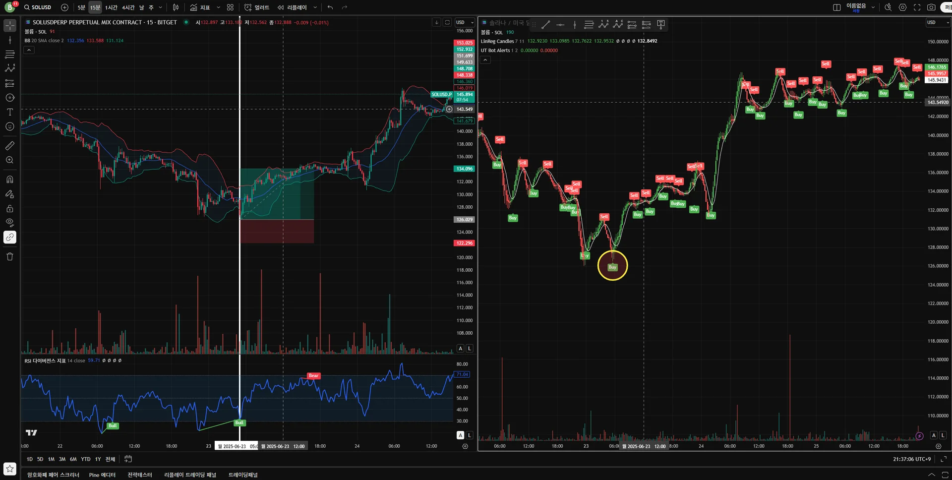 근거: 15분봉 상승다이버전스 + 추세선 저항 맞고 상승 패턴 + 돌파 가능할 것이라고 판단