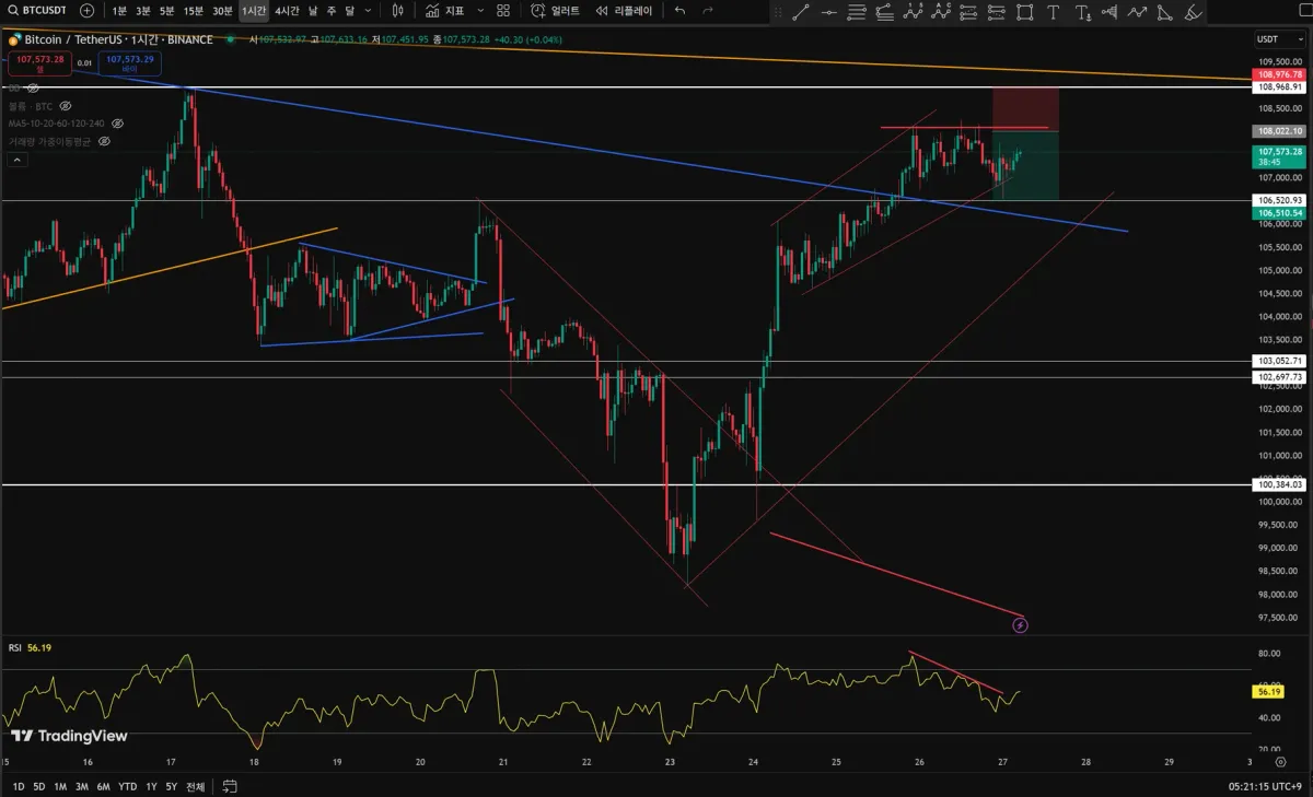 전고점 부근에서 수차례 저항하고 가격은 상승하였으나 거래량과 RSI는 감소 추세.
