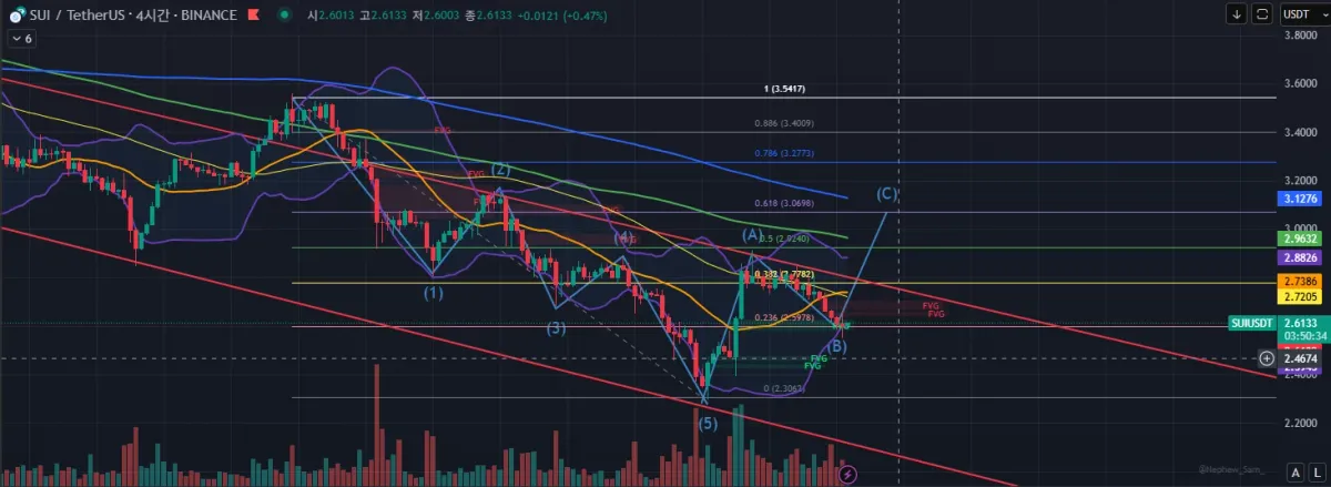 하락 채널링 형성 중 5파가 끝나고 상단의 하락채널링을 체크하러 가는 움직임 + 피보나치 0.236 부근을 3번 잘 지켜주는 모습을 보아