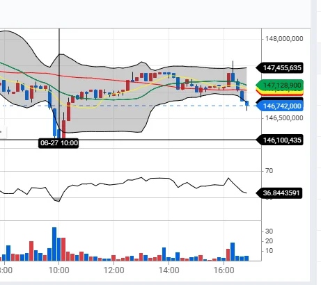 해외 거래소 이용이 아직 어려워 국내 거래소를 이용하고 있음. 사용한 패튼는 볼린져밴드 , RSI 입니다. 볼린져밴드 하단 아래로 캔들이 떨어지고, RSI가 과매도 구간으로 보아 매수함. 손익비 계산을 못한 상태.