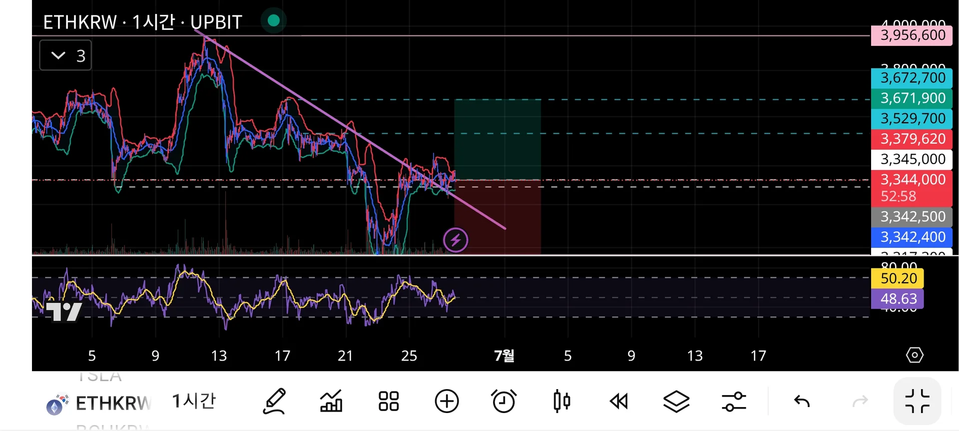 1시간봉: 하락추세로 전환되었다가 하락 추세선을 돌파하고 볼린져 밴드 상단 찍은 것 확인. >상승추세로 변환되는 것이라 판단하여 진입.
