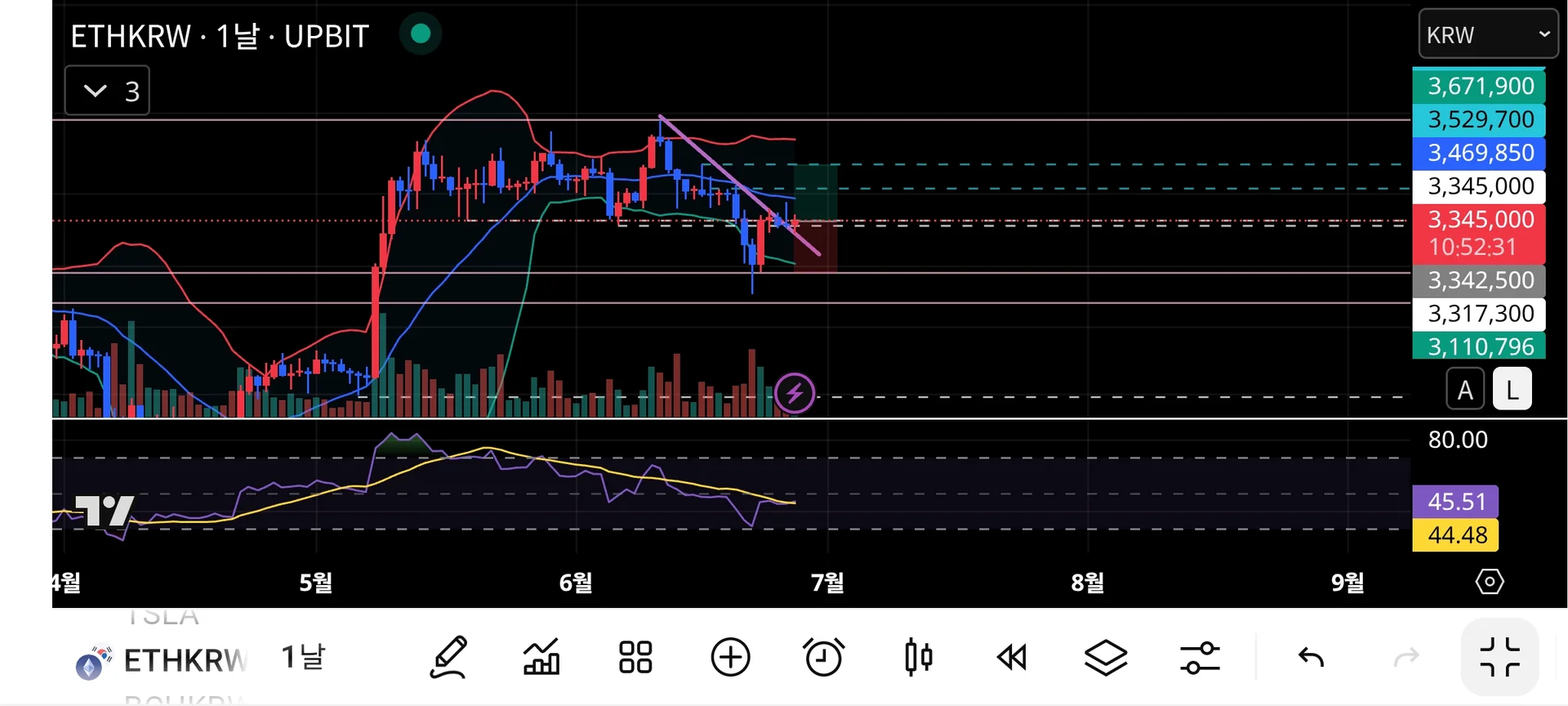 1일봉: 가격이 횡보 하며 5월부터 이어지고 있음.