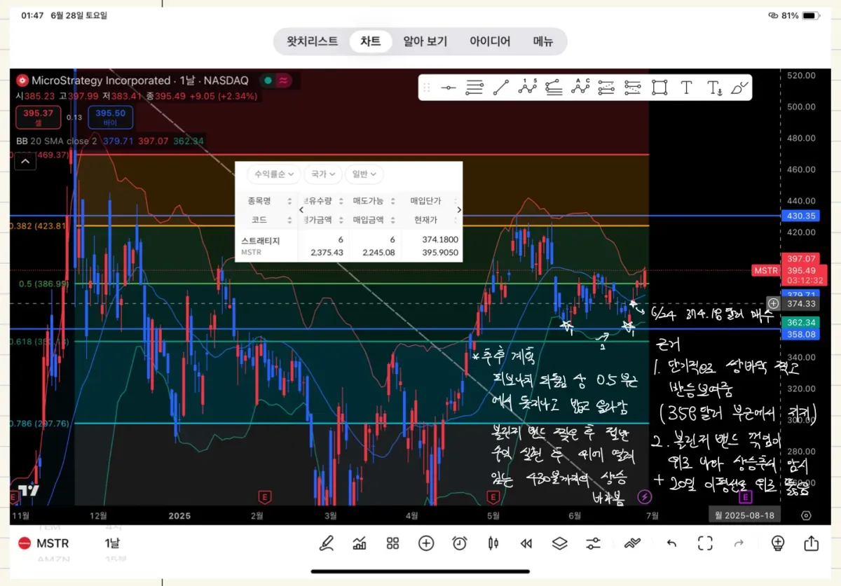 비트코인과 유사하게 움직이는 스트래티지 종목을 매입했고, 현재 5.8% 정도의 수익 보고 있습니다.