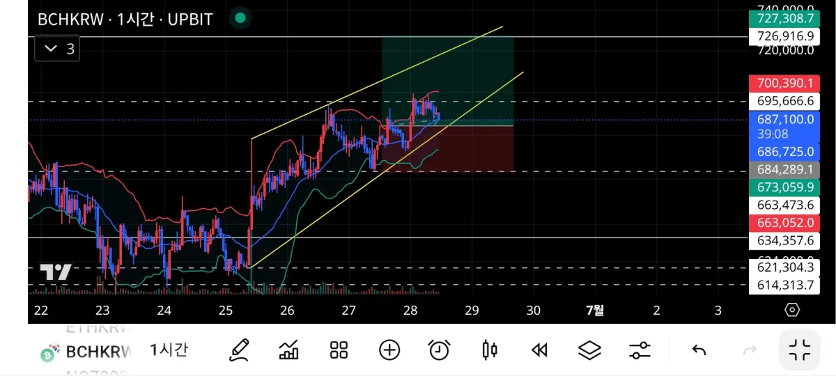 노란색 하단 추세선에 달고 상승하는 덧을 확인하고 진입.