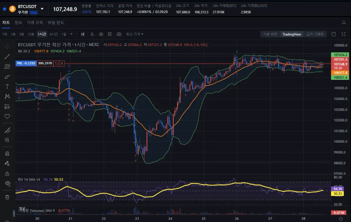6월 28일 기준 rsi 지수가 점점 빠지면서 50대에 머무르고 있고 볼린저 밴드도 횡보를 반복하고 있습니다.