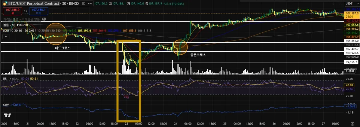 안녕하세요. 비트코인 30분 차트에 이평선을 토대로 골든크로스와 데드 크로스를 확인해보았습니다. 또한 거래량과 RSI값으로 상승 다이버전으를 찾아보았습니다