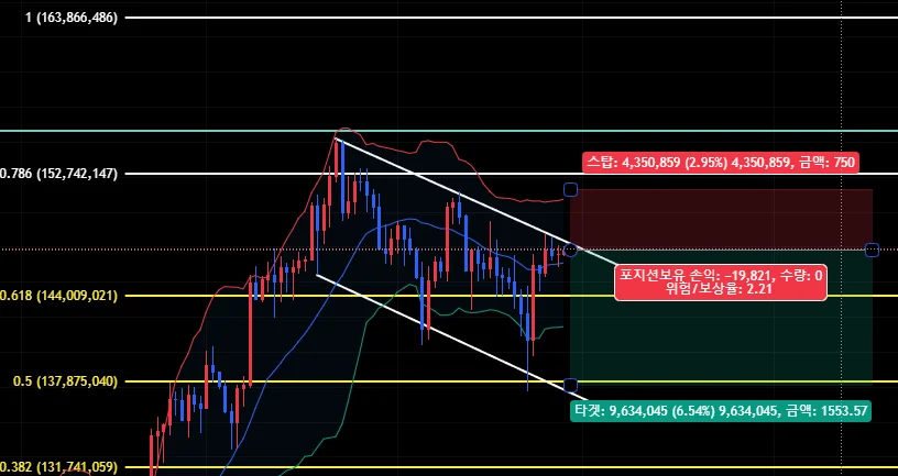 차트를 보았을때 하락장인것으로 추정이 되어 숏포지션으로 진입을 하여 손절라인은 3%를 잡고 익절라인은 피보나치 0.5에 해당하는 지지선까지 잡아 6.5%를 잡았습니다