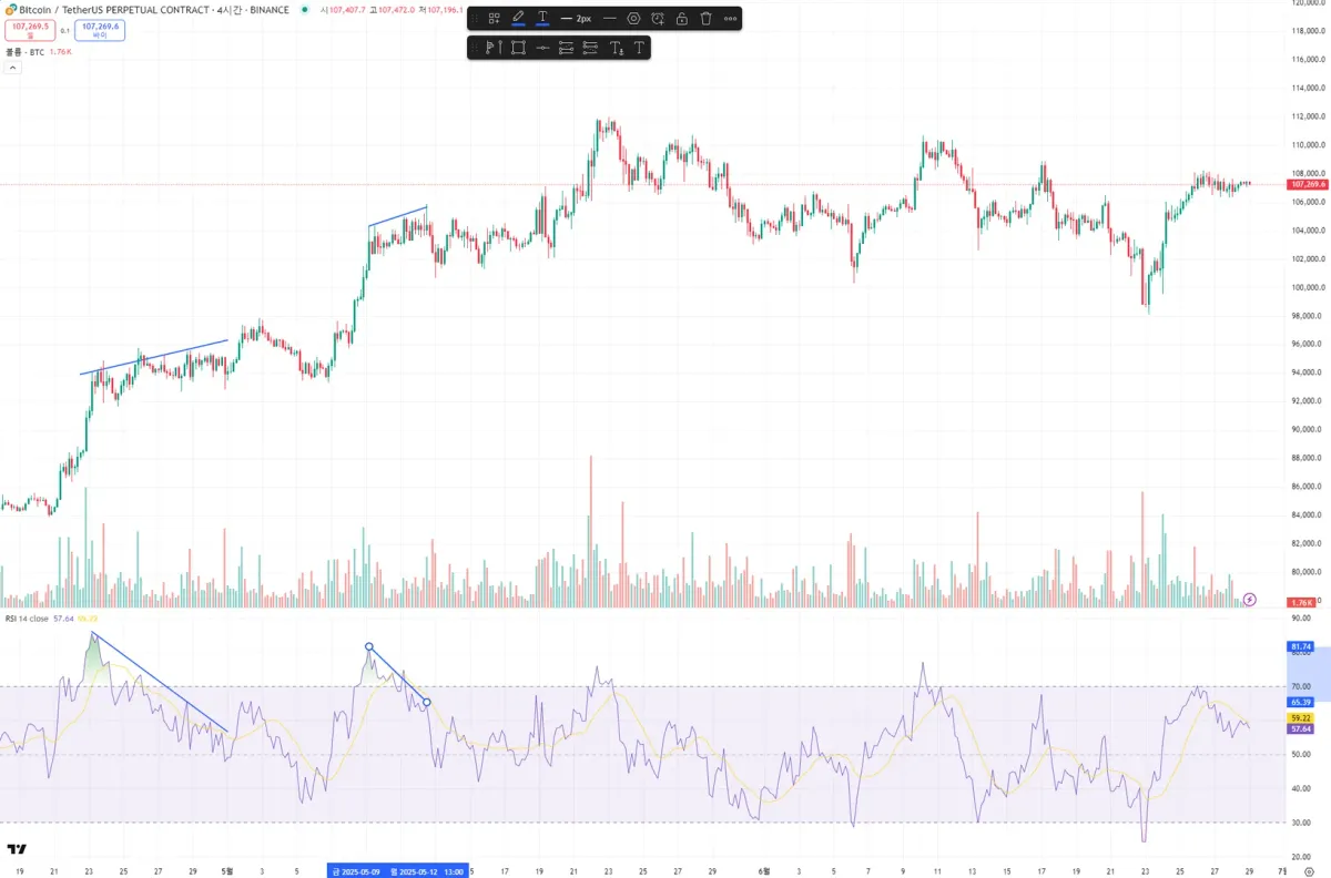 보는 것과 같이 RSI는 하락 다이버젼스이고 거래량도 줄어도는데 상승으로 계속 가는 경우가 있네요. 이런 경우는 마켓에서 뭔가 다른 재료들이 작용해서 그 흐름을 깨고 오르는 것 같습니다.